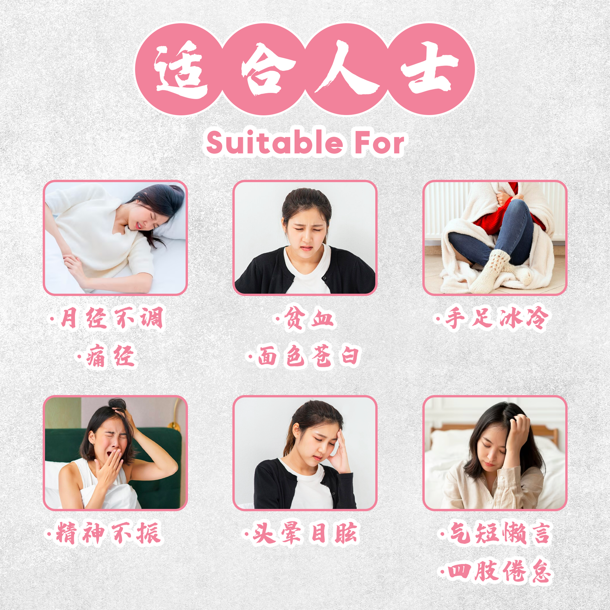 月经不调、痛经、贫血、面色苍白、手足冰冷、精神不振、头晕目眩、气短懒言、四肢倦怠