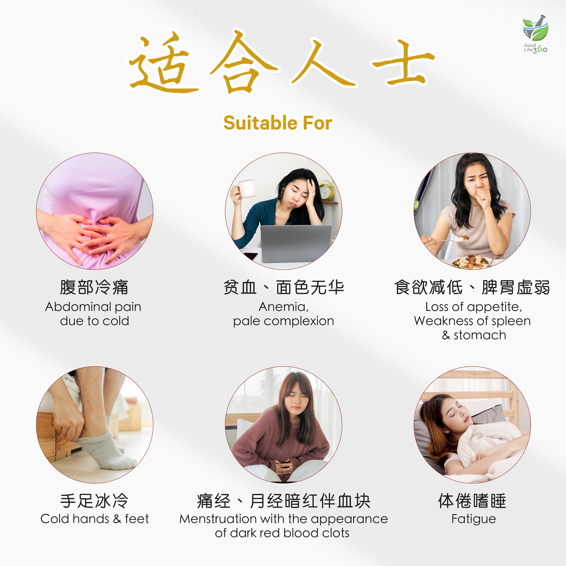 Warm meridian and dispel cold, replenish Qi and Blood, support Yang, harmonise Defensive Qi